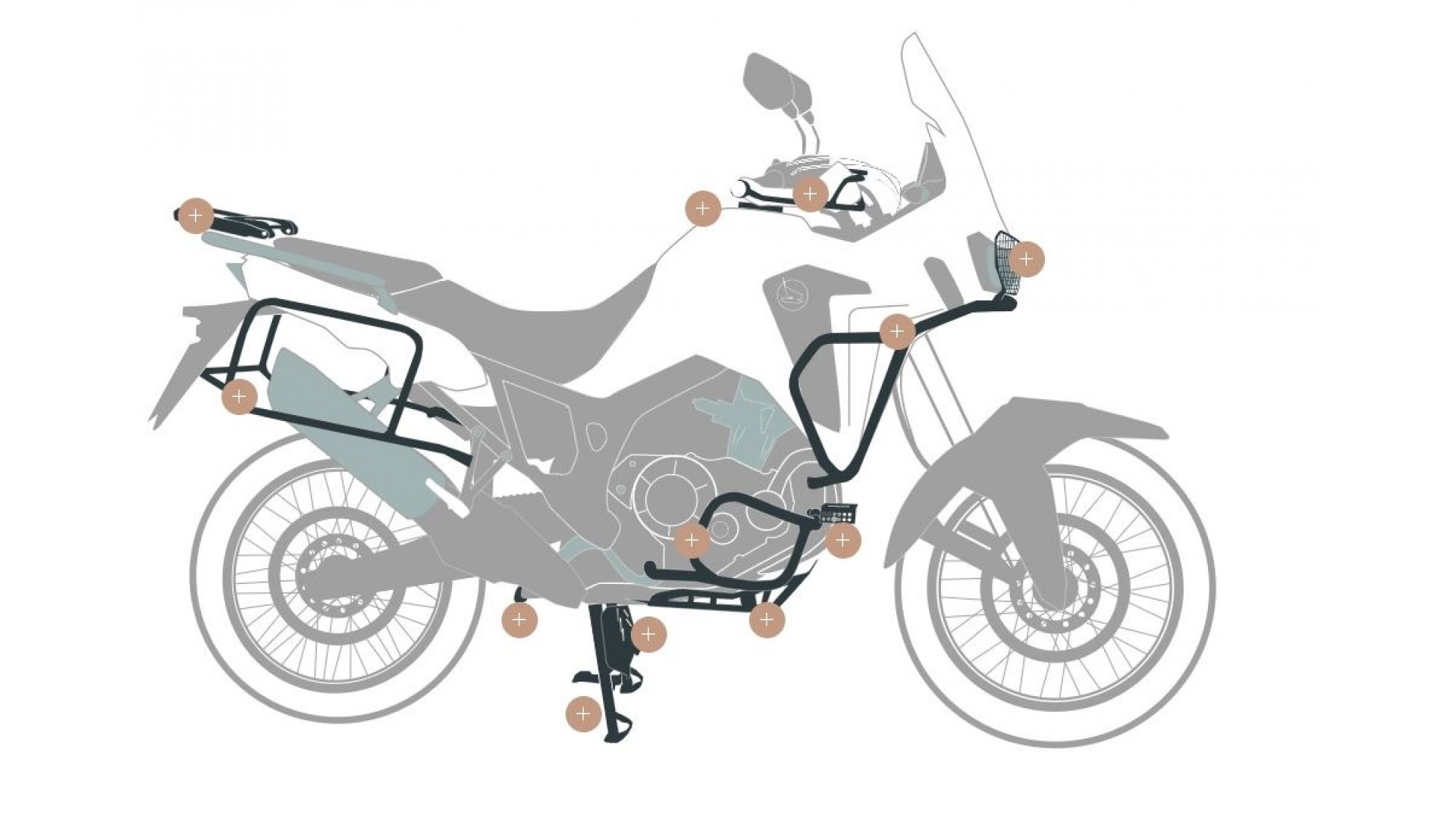 A més dels sistemes de portaequipatges i portaequipatges específics per a cada model, també desenvolupem altres accessoris indispensables com Peces de protecció, fars addicionals, cavallet principal i molt més.
