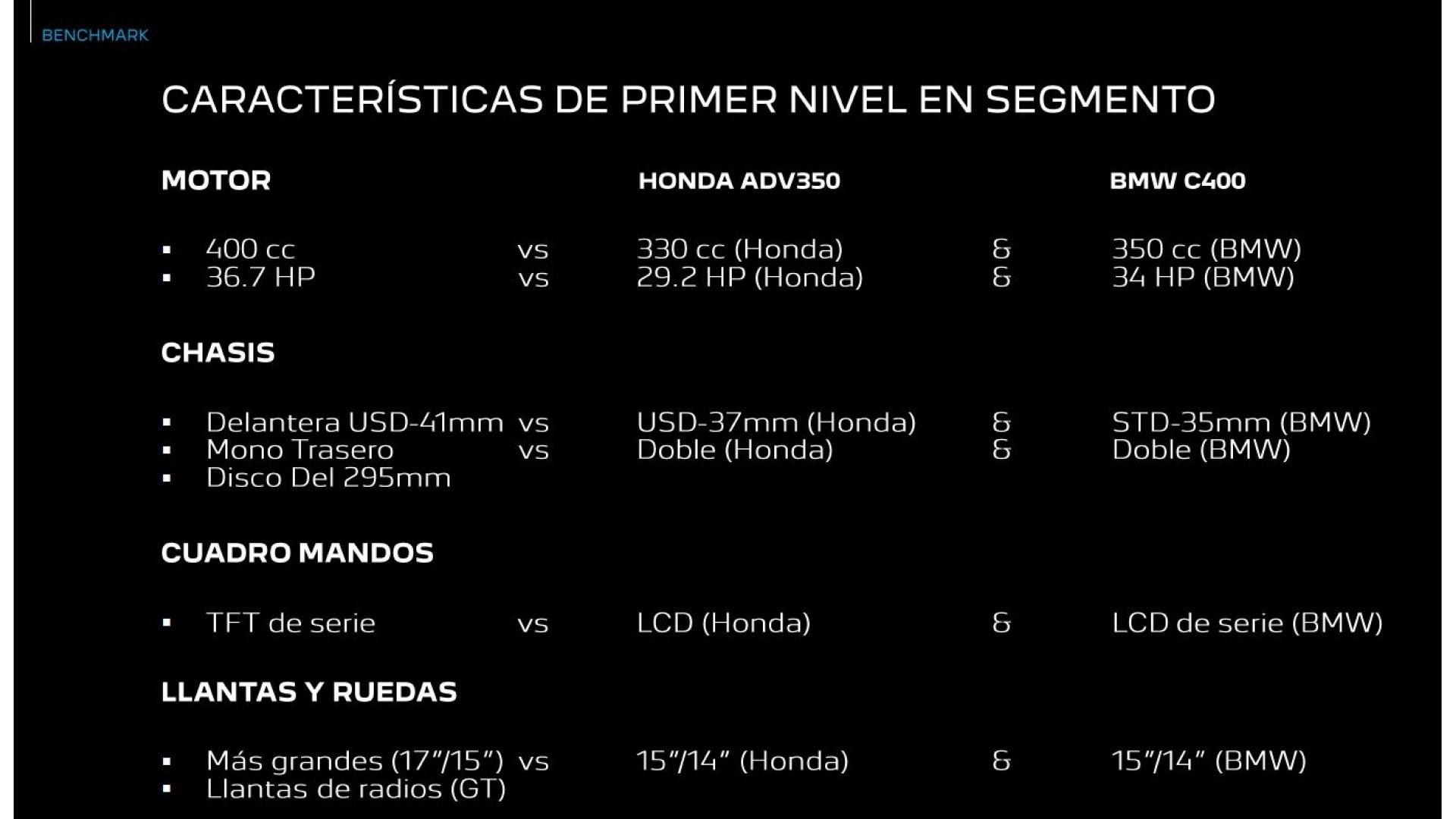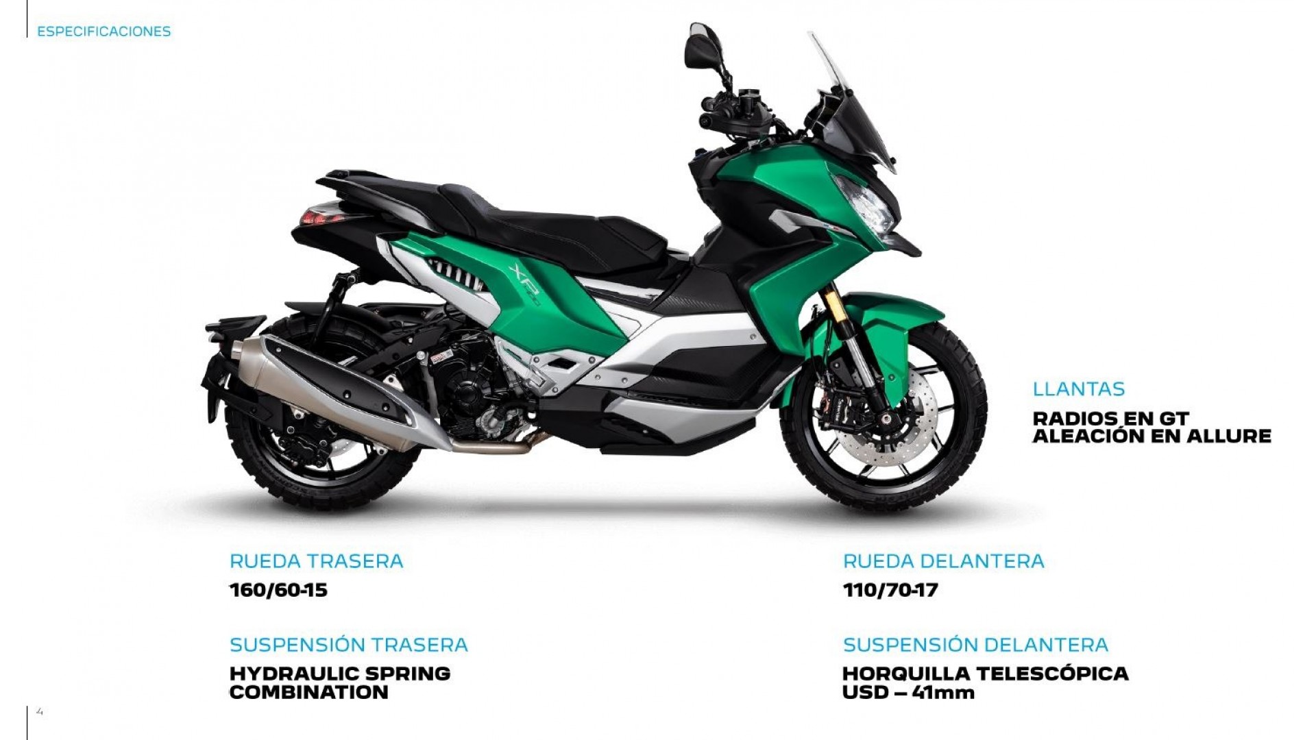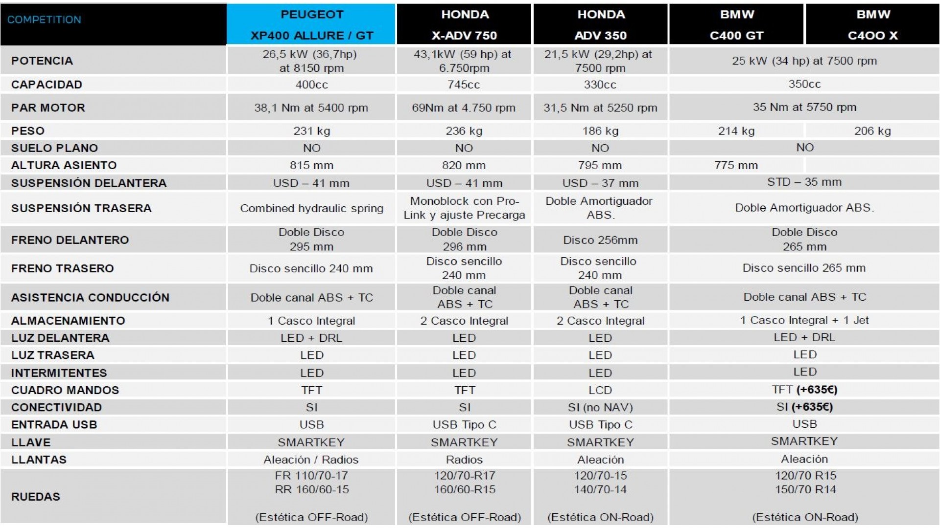 Aquest primer trimestre estarà íntegrament dedicat al llançament de la nova XP400 al mercat europeu: en les seves dues versions, el model compta amb fars full LED, forquilla invertida amb 140 mm de recorregut, frens de disc dual davanter de 295 mm i del darrere de 240 mm. L'ABS de doble canal, la clau intel·ligent i el pes declarat de 231 kg també són idèntics. Mateixa pantalla TFT de 5 polzades, port USB i un ampli compartiment d'emmagatzematge sota el seient. Tant l'Allure com el GT estan equipats amb un motor monocilíndric de 400 cc refrigerat per líquid capaç de lliurar 36,7 CV a 8.150 rpm i 38,1 Nm a 5.400 rpm.