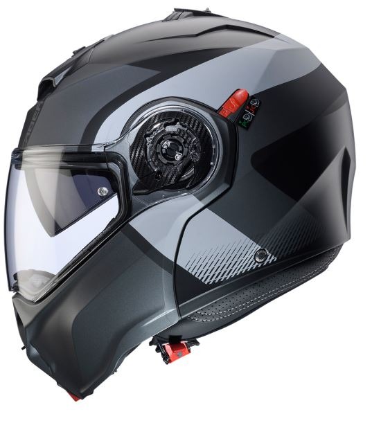 DUKE EVO està homologat ECE 22.06 P/J el que permet conduir amb seguretat fins i tot amb la mentonera aixecada gràcies al selector situat a l'esquerra del casc que, en posició J, bloqueja la mentonera a la posició de màxima obertura evitant així tancaments accidentals.