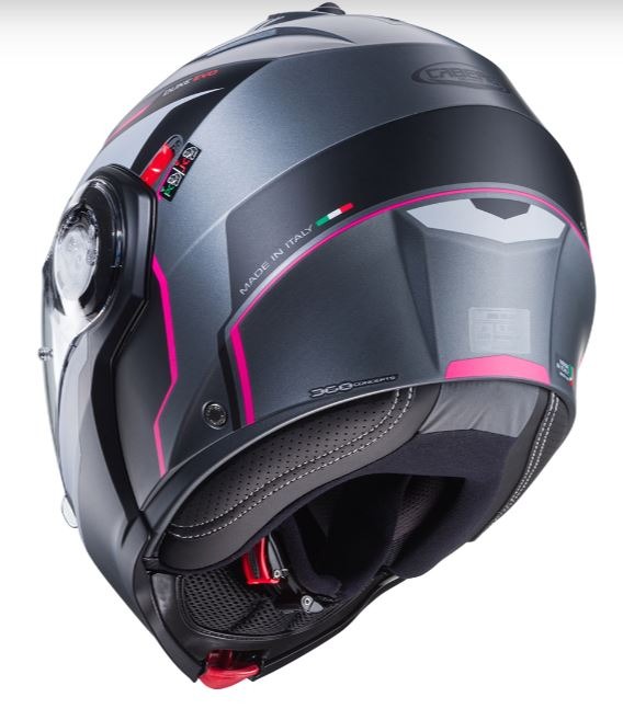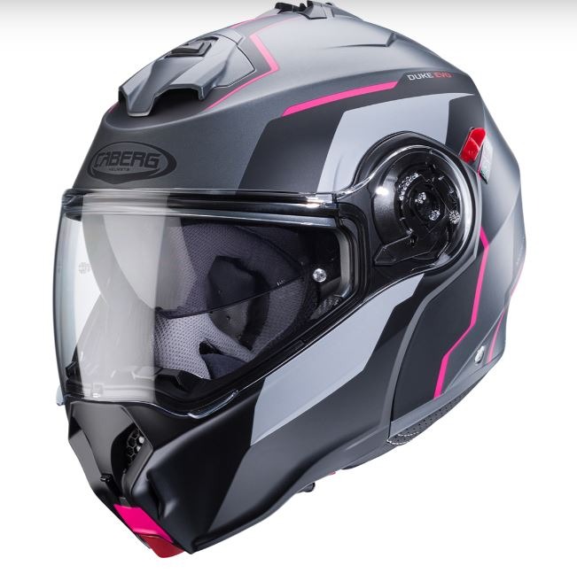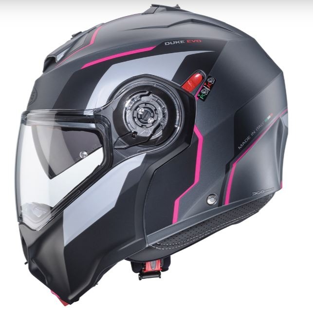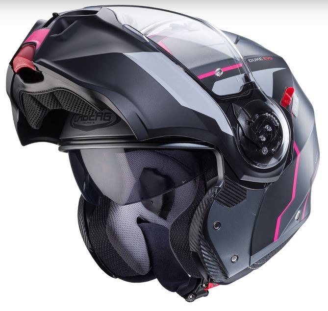DUKE EVO és l'evolució del popular casc abatible DUKE presentat per Caberg el 2012 i que immediatament va obtenir excel·lents comentaris dels motociclistes per la seva excel·lent relació qualitat-preu, volum i pes reduïts i un excel·lent nivell de seguretat certificat també per les 5 estrelles de la prova AGUDA.