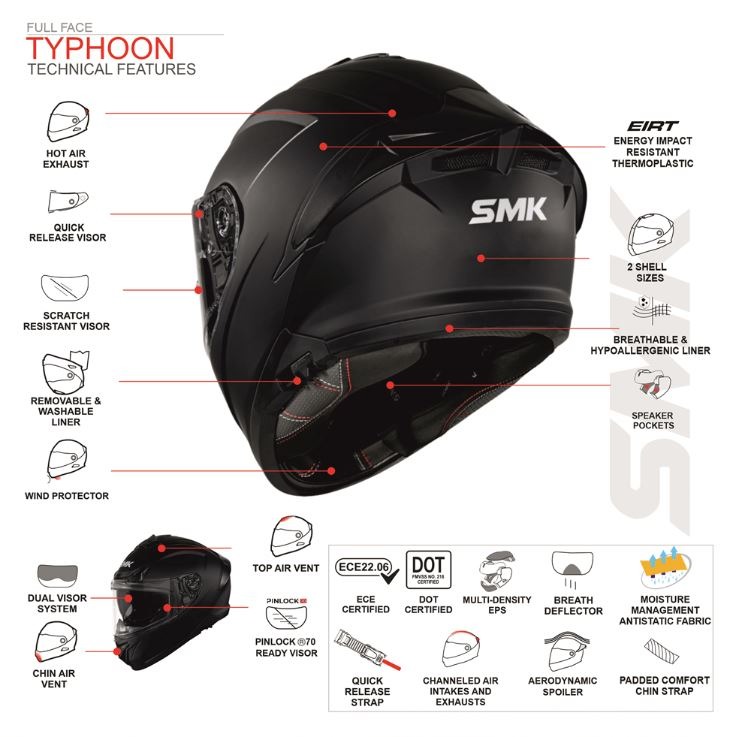 TYPHOON REPTILE és un casc integral amb un disseny de carcassa compacte i aerodinàmic que atrau els ciclistes esportius i els que viatgen diàriament. La gamma de cascs Typhoon de SMK inclou característiques de seguretat i comoditat líders a la indústria. Millorat amb gràfics sorprenents i colors sòlids, et dóna l'opció de triar-ne un que s'adapti al teu estil de vida!