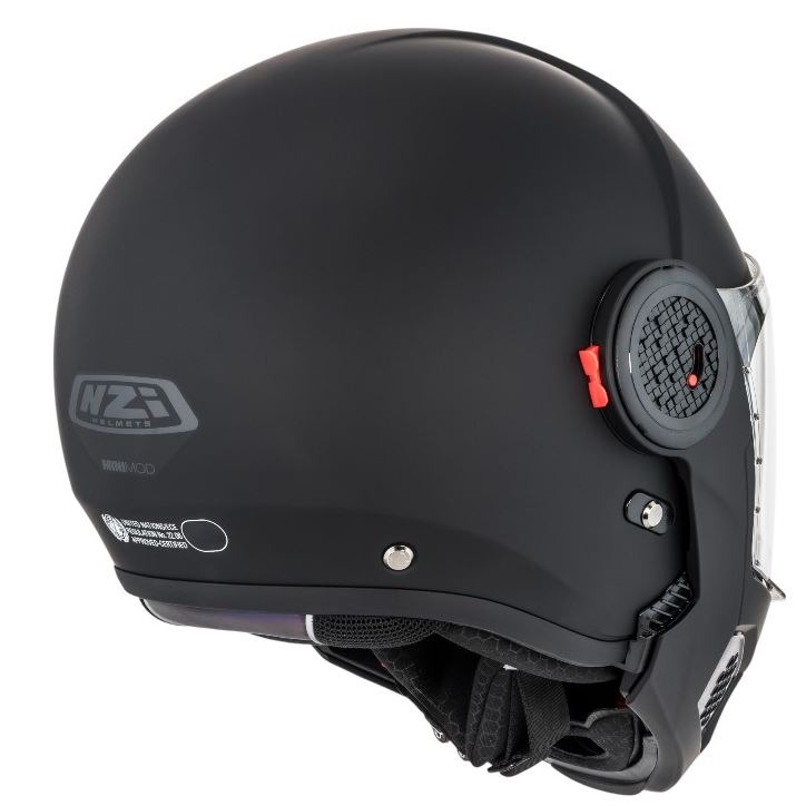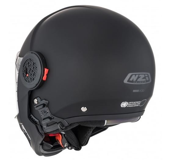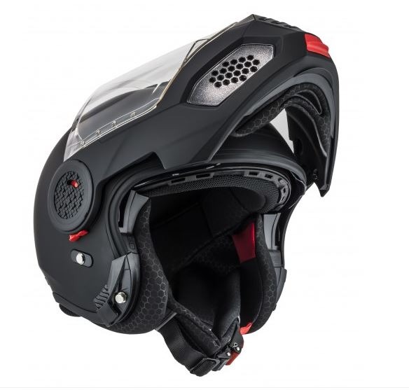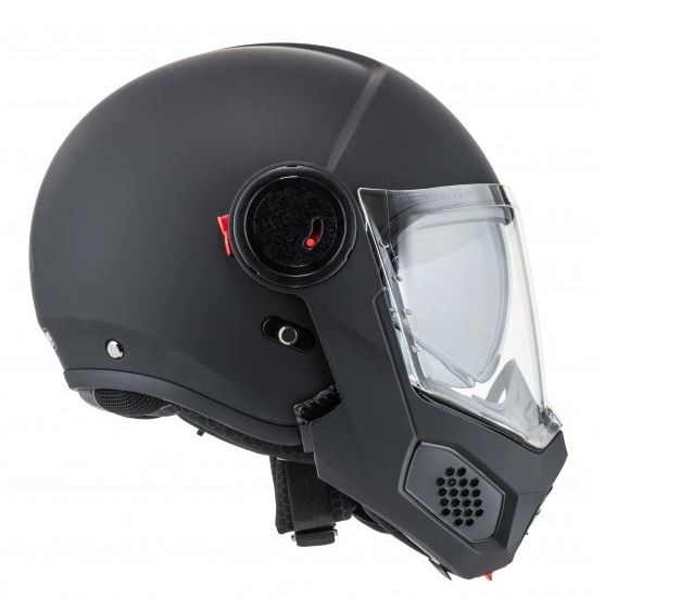 Mecanisme de tancament de protecció maxil·lar abatible de metall reforçat. Sistema de retenció reforçat, per mantenir el casc al seu lloc sobre el cap del motociclista sigui quina sigui la direcció d'on provinguin els impactes. Senyalitzador reflectant, evitarà accidents per abast.