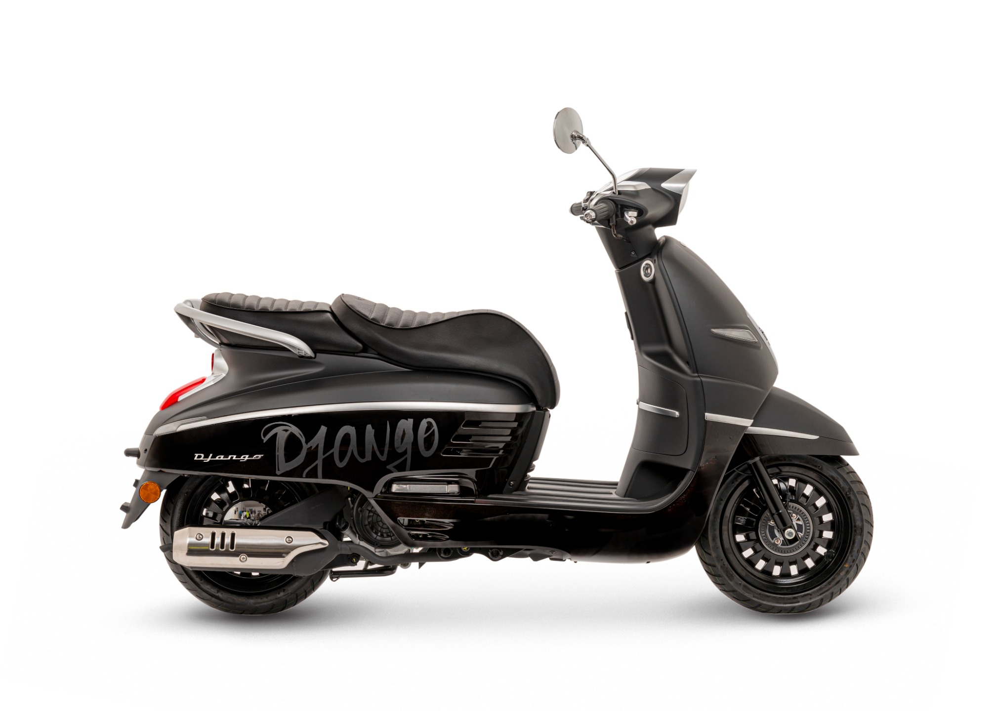 No hi ha estil sense confort. Alçada de selló reduïda (770 mm), terra pla pintat amb els colors de la carrosseria, elegants làmines antilliscants, guantera: cada sortida amb Django és còmoda, sigui quina sigui la teva mida.
