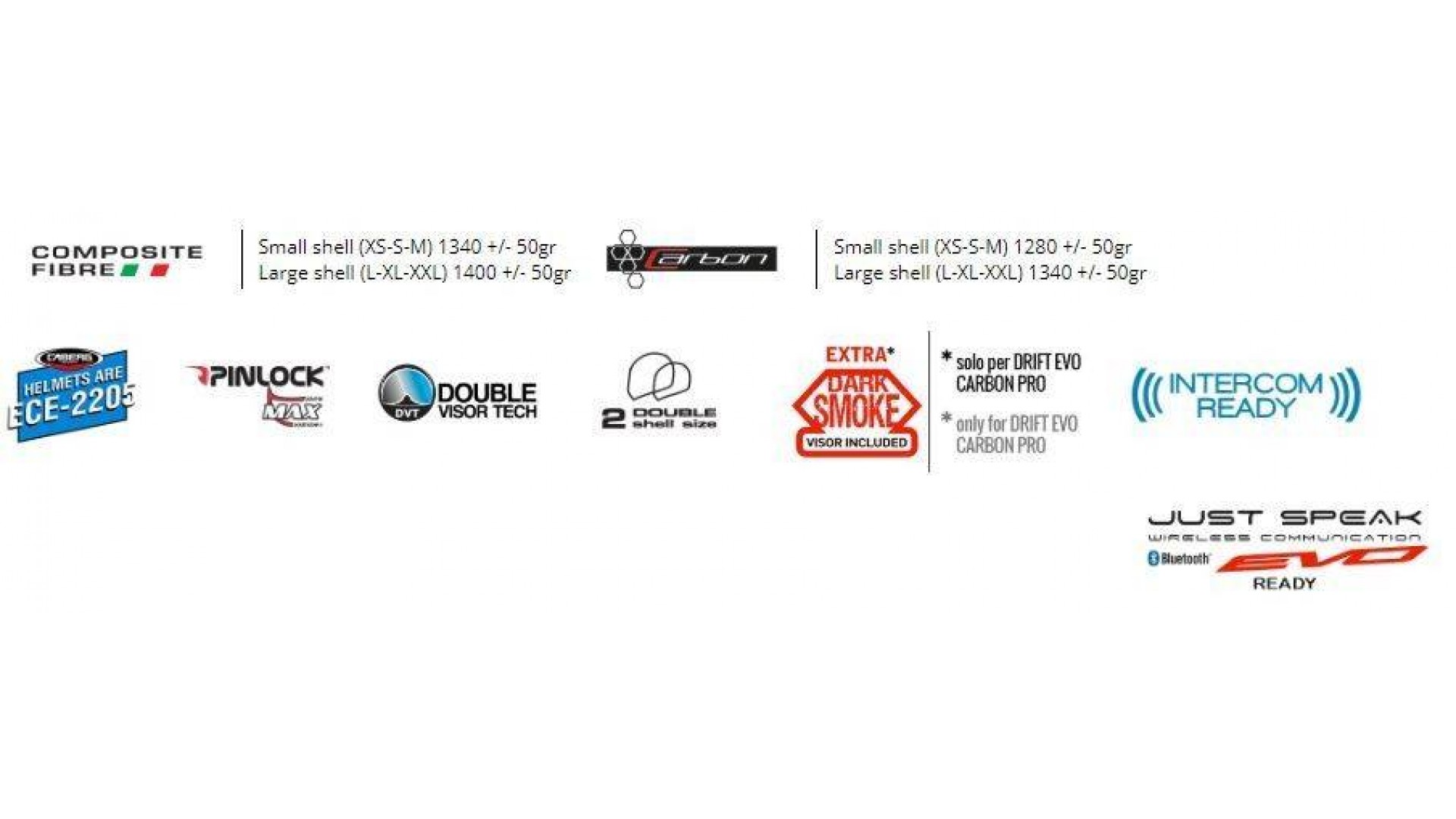 DRIFT EVO se ofrece en dos versiones de color blanco brillante y negro mate. También se ofrece a las versiones gráficas INTEGRA, GAMA, VERTICAL y STORM. Las versiones disponibles de DRIFT EVO con carcasa de carbono son DRIFT EVO CARBON PRO, con cáscara de todo carbono y acabado pulido, con una visera oscura adicional incluida en el paquete, y dos versiones DRIFT EVO CARBON con gráficos amarillos fluorescentes y gráficos blancos, ambas con acabado mate. Todas las versiones tienen unos interiores completamente desmontables y lavables, incluyendo el reloj de la correa de cierre, hebilla de doble anillo y disposición para montar los sistemas de comunicación más comunes, gracias a los asientos actuales para altavoces y micrófono. DRIFT EVO se puede equipar con el nuevo comunicador CABERG JUSTO SPEAK EVO.