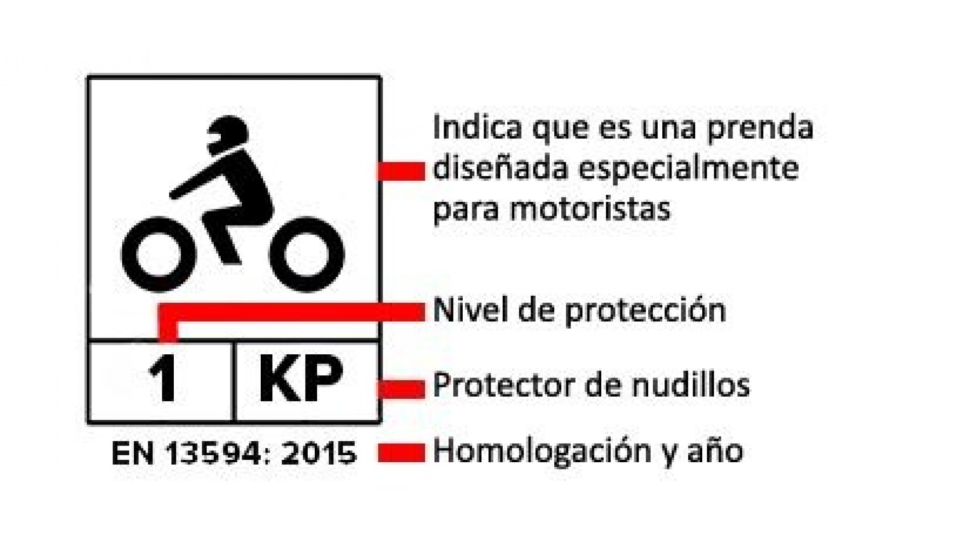 Tal como se puede ver, la etiqueta consta de un ícono de moto el cual nos indica que se probó específicamente como un guante de moto. La casilla con numeración a modo de clasificación que indicará un "1" si ha pasado las pruebas básicas como Nivel 1 o un "2" para sí ha pasado las pruebas superiores como Nivel 2. Las siglas KP indican que la protección de los nudillos que tiene el guante ha superado la prueba de impacto, en caso de estar en blanco sin KP indicará que no ha superado la prueba o bien que carece de protección para nudillos. Finalmente se indica la versión más reciente del estándar de homologación CE, en este caso la EN 13594 : 2015.